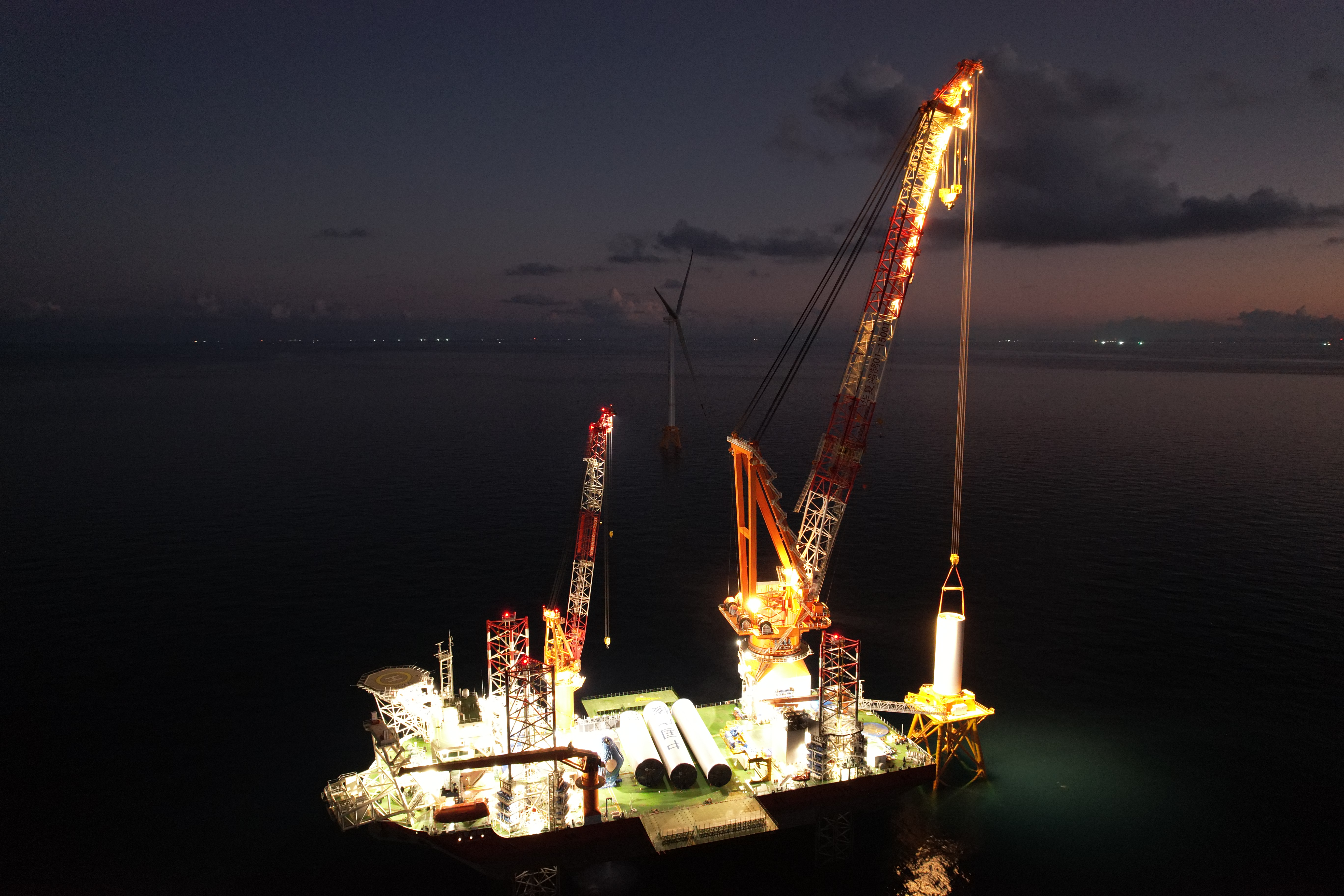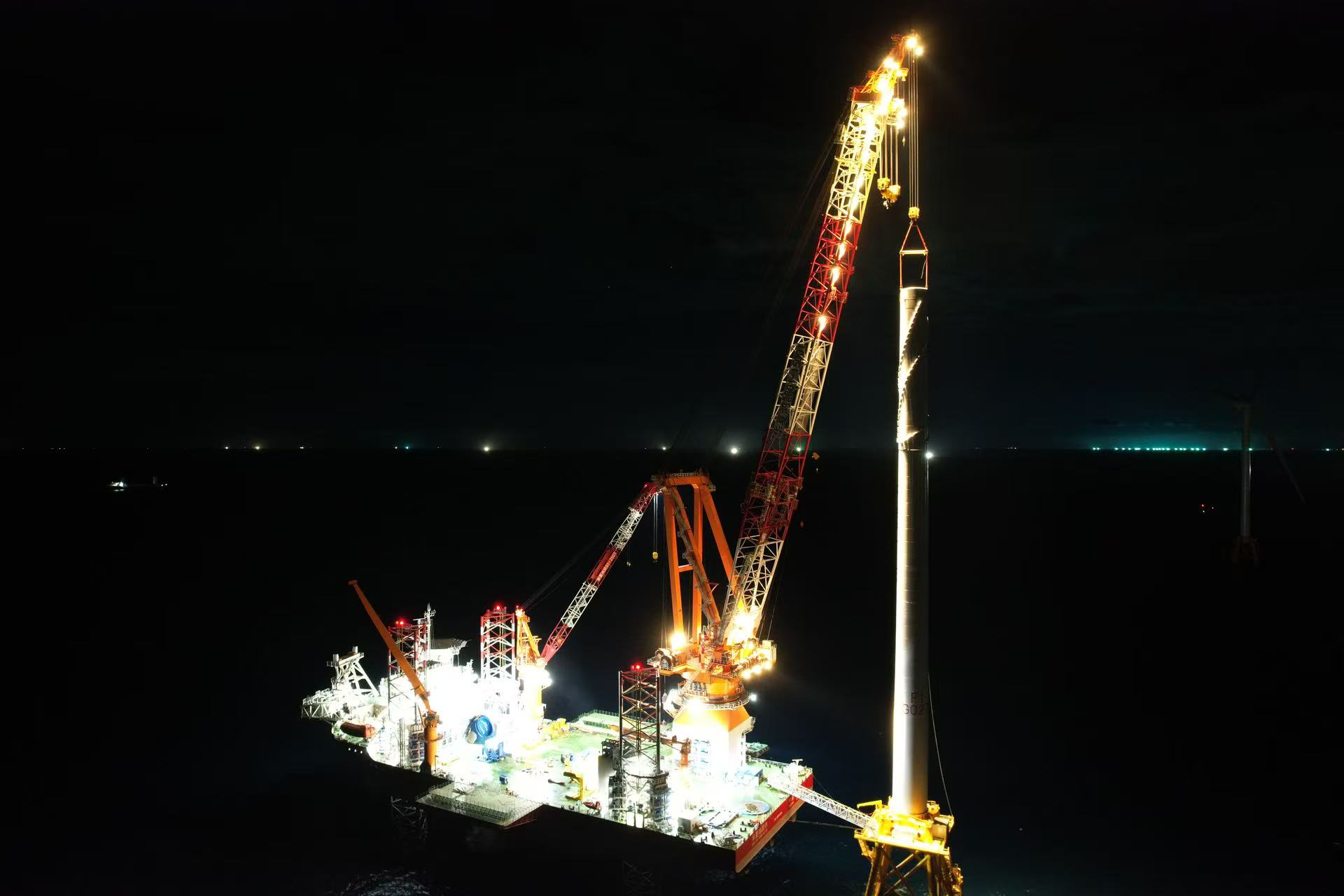 原来,B01机位的风机安装用了将近5天时间,而且还没验收,虽说有台风“塔巴”、首台磨合不充分等客观因素影响,但现在的施工效率远低于项目团队预期。不过要在3.5天内完成1台完整的风机安装、验收,而且还要把船机移位、风机设备过驳、组装的时间包括在内,对于塔筒高达xx米、叶片直径达xx米的13.6兆瓦风机来说,绝对称得上“时间紧、任务重。”