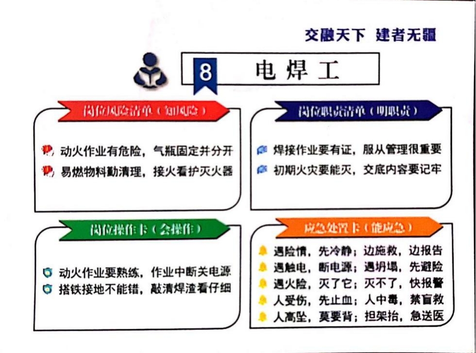 为解决作业人员安全培训“消化不良”问题,推动安全管理常态化,项目创新推出“工种专属胸卡”。胸卡背面印有各工种的岗位职责、风险点及应急处置措施,还将关键安全知识提炼成易懂口诀。作业人员可随时查看、反复学习,既强化了岗位安全认知,又切实提升了培训实效与安全管理精度。