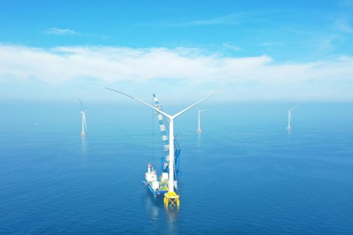 望海潮,正鸥鹭云翥、霞蔚绮绣。向晚的风“烈”了几分,召来潮涌拍向风机安装船,破碎,妆成船底柔弱的波纹。数盏探照灯与斜阳的最后一丝亮堂换岗,再邀来东天月对影成双。清辉流转,绵软如帛,那“天镜”毫不吝啬分享自己的美,为风机叶片烙印同款色,更添几分昳丽。与庞然大物的塔筒和机舱不同,修长的风叶应是神鸟的纤羽,于甲板间轻盈曼舞,又同风而起,飘然百米高空,只在暗夜中拓下一帧帧倩影。