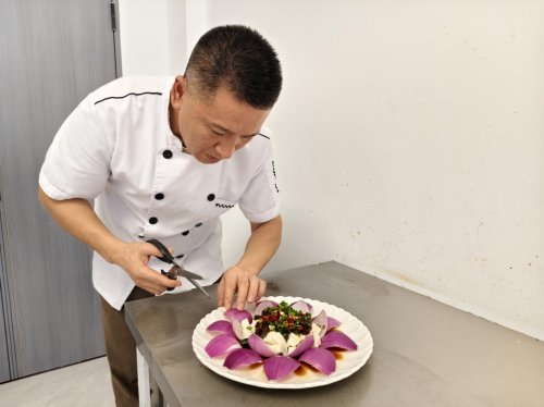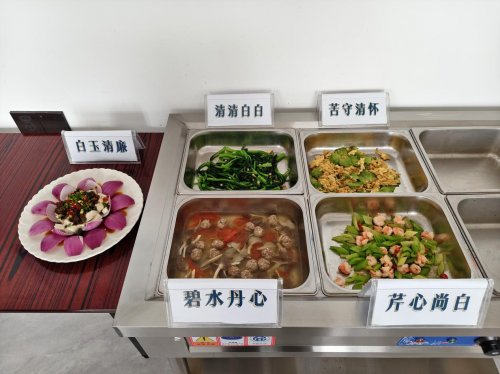 食堂内香气萦绕的背后,后厨操作间里正一派忙碌景象。厨师李师傅左手持菜篮,右手握漏勺,密切关注着沸水锅中的动态——待生菜微微蜷缩,便迅速捞出过凉,只为保留“清清白白”这道菜的脆嫩本味;另一侧案板上,他专注地处理着新研发的“白玉清廉”:将紫皮洋葱逐层剥离,巧手雕琢成绽放的莲花造型,洁白的豆腐丁与黝黑的皮蛋碎错落铺陈于花心,仿佛水墨点缀,既保留了食材的本味,又暗合“出淤泥而不染”的意境。