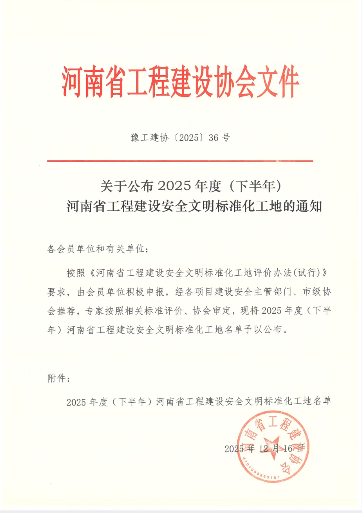 共工新闻社12月22日电(通讯员:周宏政)2025年12月16日河南省工程建设协会发来捷报,中交一航局兰太高速四标项目凭借其卓越的安全生产管理、高标准的文明施工水平以及绿色环保的施工理念,成功获评“2025年度(下半年)河南省工程建设安全文明标准化工地”荣誉称号。