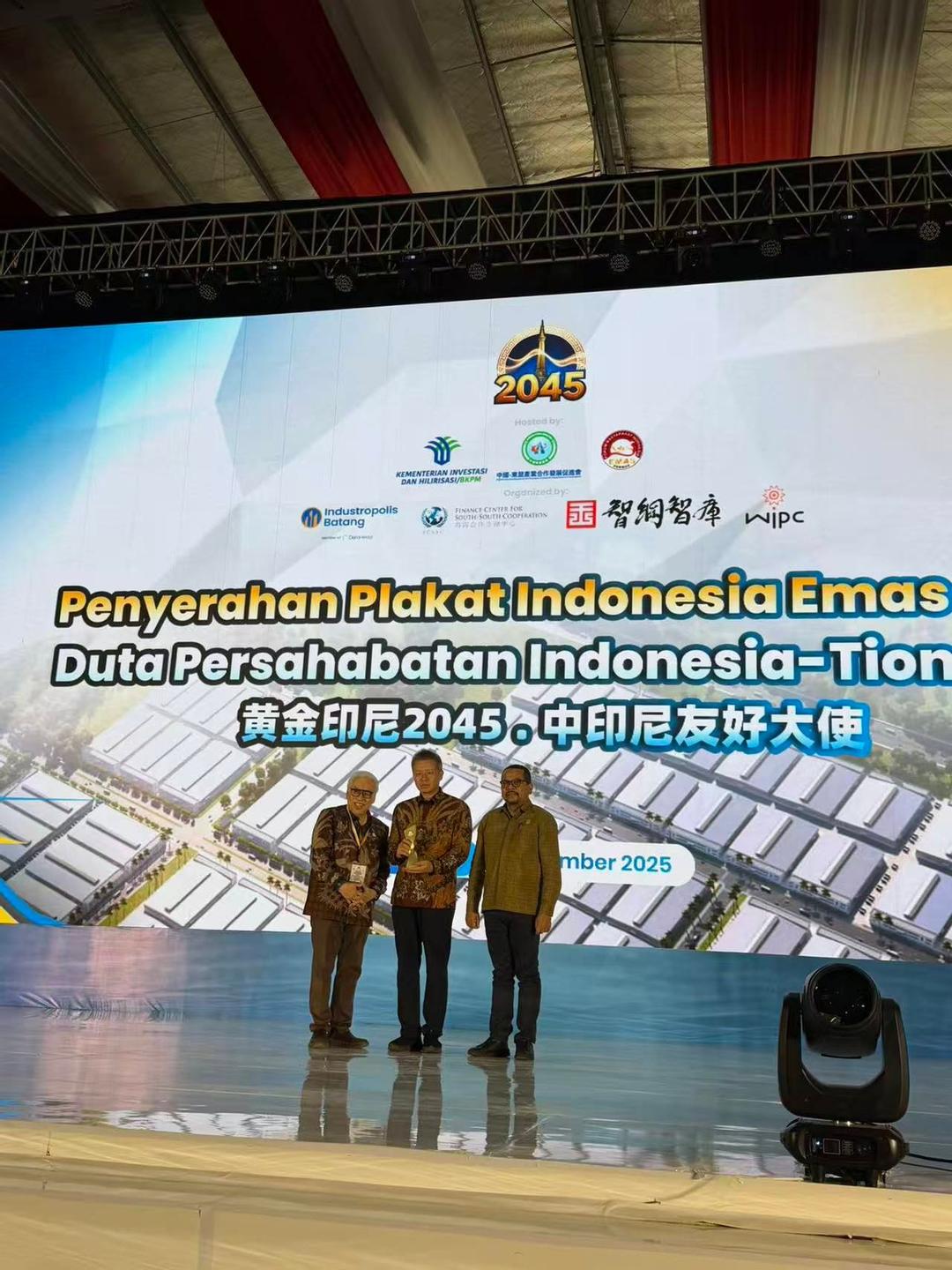 与会发言部县政府领导、专家一致高度肯定万信达园区的实业规模和陈日铃董事长超强组织宣传协调能力在出海企业家的声誉,鉴于万信达董事长陈日铃耕耘巴塘万信达工业园区的建设和对为上千家的中资企业,近2万人来访印尼考察引导讲座,宣传践行中印尼之间企业互补合作双赢和发展经济及文化交流的所做工作贡献,由总统办公厅主任Muhammad Qodari先生、VOX POINTIndonesia 全国主席FORMAS印度尼西亚黄金社会论坛Yohanes Handojo主席颁发给陈日铃先生为“黄金印尼2045中印尼文化使者”的荣誉称号。