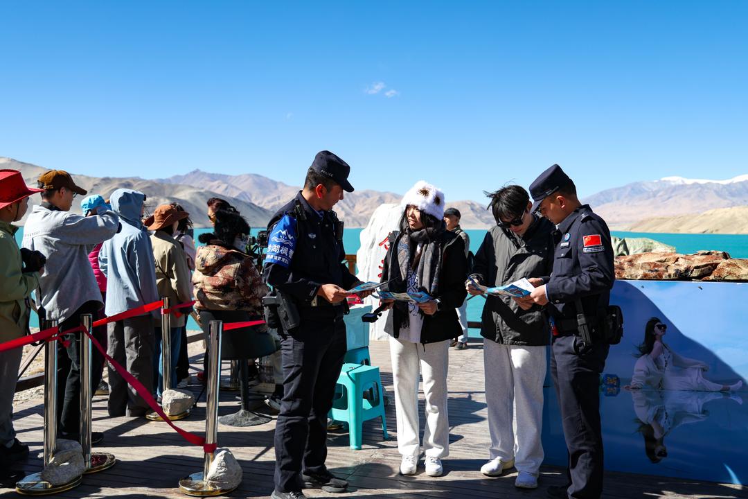 共工新闻社10月15日电(通讯员:彭虎成)10月14日,新疆出入境边防检查总站克州边境管理支队加克拉克边境派出所创新宣传方式,组织民警深入景区开展流动反诈宣传。