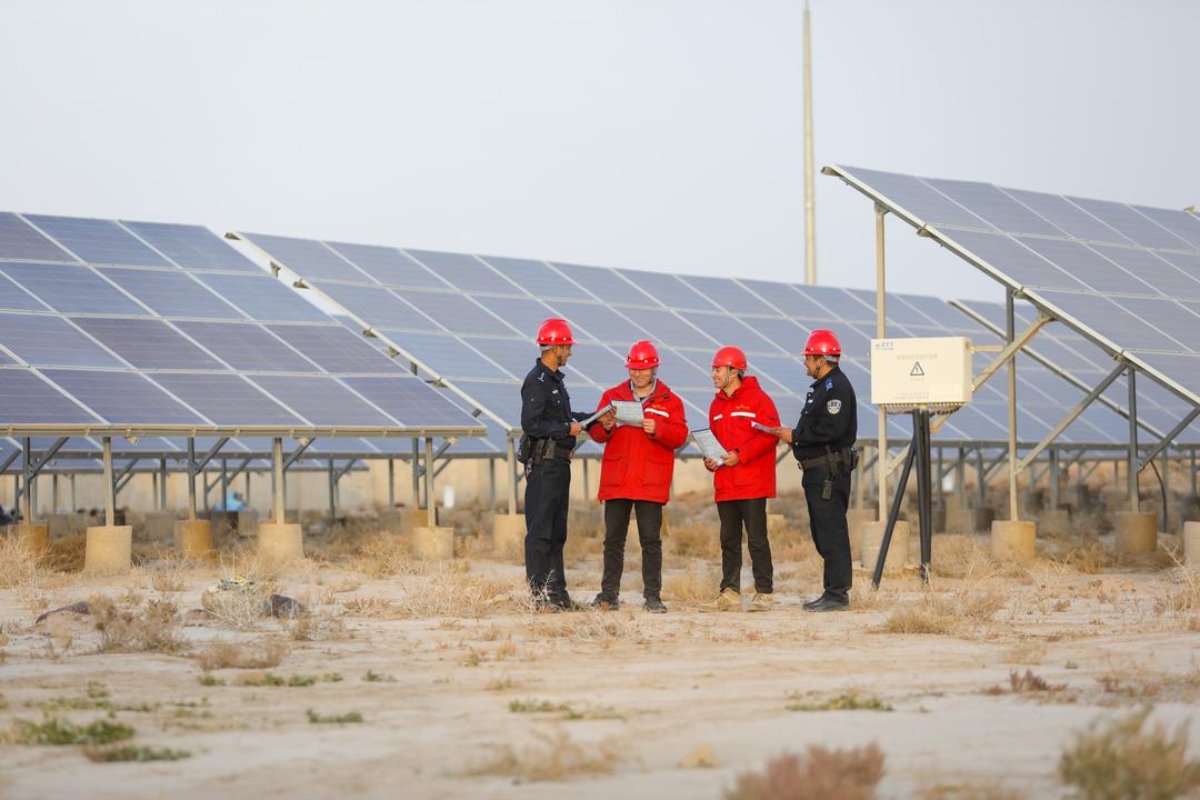 如今,在叶城县茫茫戈壁上,蓝色光伏板绵延铺展,与民警巡逻的身影相映成景。通过警企同心、政企联动,当地正以光伏产业为支点,撬动县域高质量发展,让绿色能源不仅照亮荒漠戈壁,更成为推动经济增长、生态改善、民生提质的“新引擎”。