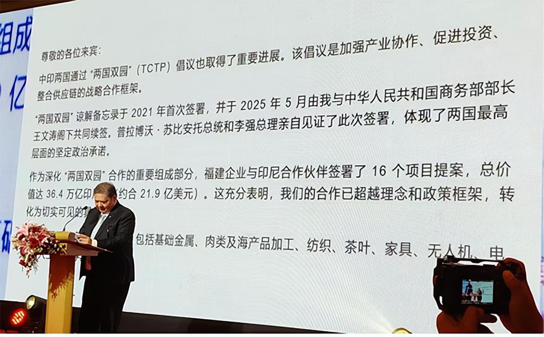 印尼经济统筹部长艾尔朗加在致辞中指出,中印尼通过“两国双园(TCTP)”倡议取得了重要进展。该倡议作为加强产业协作、促进投资、整合供应链的战略合作框架,于2021年首次签署,并于2025年5月由其本人与中国商务部部长王文涛共同续签,印尼总统普拉博沃·苏比安托和中国国务院总理李强亲自见证签署,充分体现了两国最高层面的坚定政治承诺。作为深化“两国双园”合作的重要成果,福建企业与印尼合作伙伴已签署16个项目提案,总投资额达36.4万亿印尼盾(约合21.9亿美元),合作已从理念与政策层面转化为实实在在的落地项目。