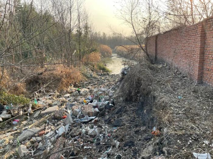 河道和河岸倒满了垃圾沿河道向南约200米,基本没有干净的路面,记者一路踩着垃圾前行至尽头,发现尽头处是墨水河的支流,有不少水,在河道和墨水河支流交汇处,记者发现不少黑色泥沙散落在河道上。