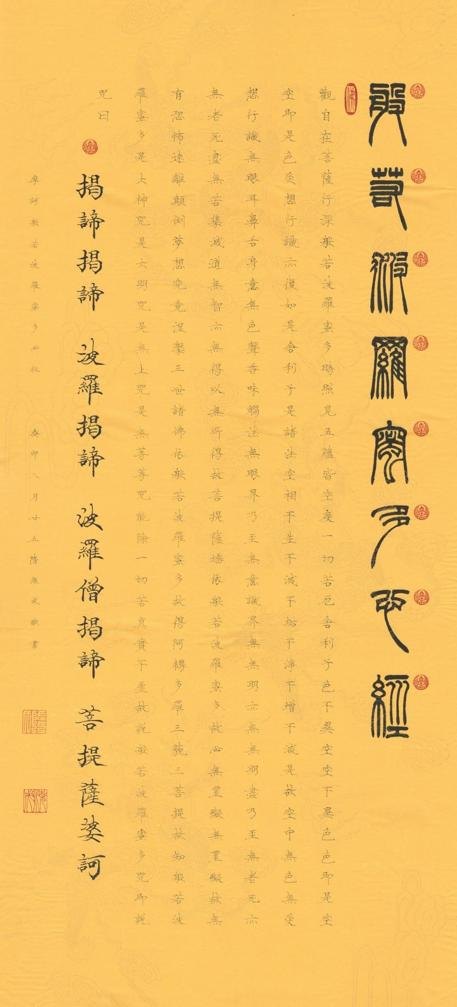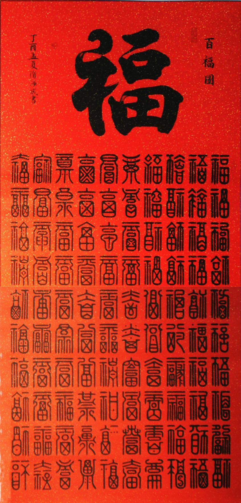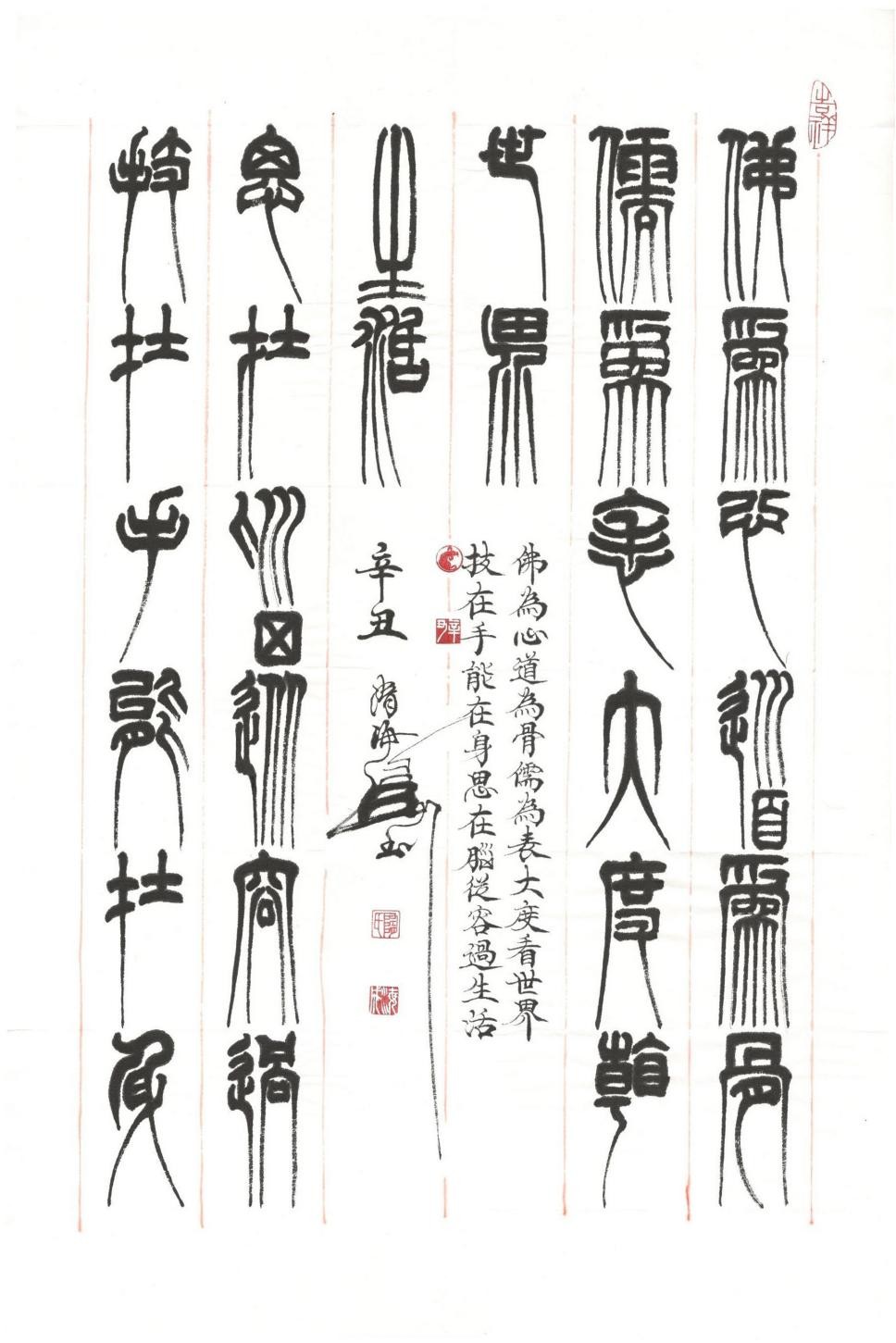在艺术追求上,隋海成始终秉持"师法秦汉、传承晋唐、崇尚自然"的理念。他的楷书清隽秀润且法度严谨,线条灵动如"玉箸清光";行书劲健取势、虚和得韵带有刀劈斧凿之功,尽显书卷神采;篆书更是入古至深,上溯秦汉碑碣的雄浑气魄,下汲清代诸家的文人意趣,线条铁画银钩,朴拙中见灵秀,将金石之气与书卷之韵熔于一炉。尤为难得的是,他从承德山水间悟道,将大山的稳健、流水的飘逸、鸟兽的灵动融入笔端,使笔下文字兼具"江河奔流的美感"与"渊渟岳峙的静气",形成了"古法与自然相融、突出动感"的独特风格 。其创作的《百福图》《百寿图》《道德经》《心经》等长卷,或寸楷如米,或笔走龙蛇,方寸之间尽显定力与才情,不仅深受收藏界青睐,更在全国实力派书画家邀请展中被高价收藏。