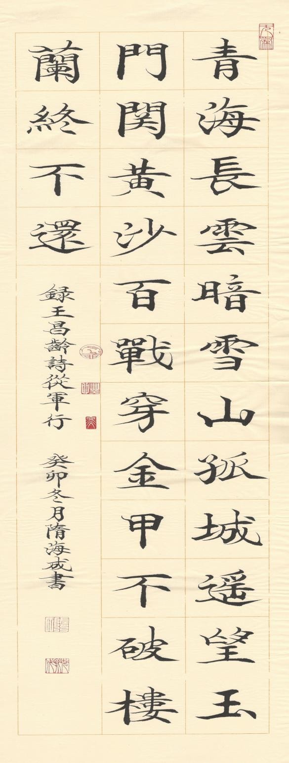 隋海成的书法之路,始于儿时山崖上的乾隆御笔碑刻。那些刻在石头上的点线笔画,如无声的启蒙者,让他用树枝在地上一遍遍描摹,从此与书法结下不解之缘 。8岁研习唐楷、临摹碑帖,12岁专攻硬笔书法,少年时的他便展现出超常的毅力与悟性。数十年间,他坚持每日清晨五点起床临池,出差途中背帖不辍,甚至达到"无笔写字、用心临帖"的境地,以"磨秃千支笔、熟读万卷书"的苦修,练就了软硬笔兼擅的扎实功底 。硬笔书法中,楷、隶、篆、草、行、魏、宋等字体皆能信手拈来;毛笔创作里,秦汉篆隶的雄浑、魏晋风流的气韵、唐宋诸家的意趣,都在他的笔墨间自然流转。