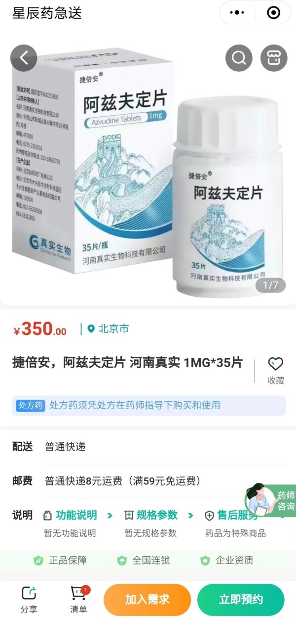 记者注意到河南真实生物科技有限公司生产的阿兹夫定片已在本市海王星辰连锁药店正式线上开售,患者可通过“海王星辰药急送”微信小程序下单,填写处方信息后,可预约下单。目前每瓶售价350元,每瓶35片,规格为1毫克。