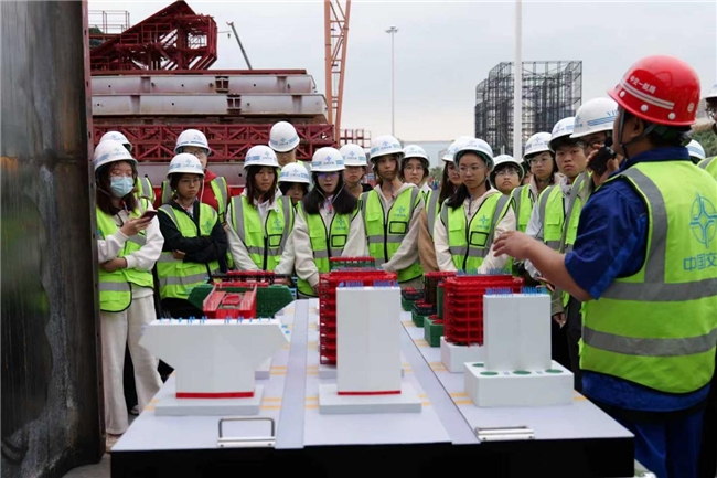 在出運碼頭,師生們瞭解了墩臺通過頂運一體臺車系統,沿軌道精准橫縱移、經1:10斜坡道平穩溜放、最終裝船出運的全流程。專案依託兩個出運平臺和三組大型半潛駁船組,構建起高效協同的墩臺出海通道。通過智能檢測系統對構件溜放與航行過程進行即時穩定性監測,並結合低重心轉運平臺設計,全面保障了187個墩臺在複雜海況下的安全出運。