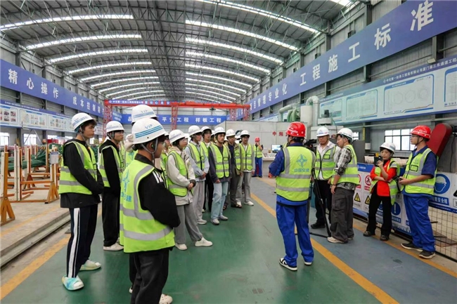 在環氧鋼筋加工車間,師生們觀摩了從拋丸除鏽到智能加工的全自動生產線,該線日均產能達130噸,並通過尼龍護板等細節設計,保障塗層“零損傷”。而在大體積混凝土防裂環節,專案通過優化配合比、智能溫控與迴圈水冷技術,實現對構件內部溫度的精准控制,從源頭保障墩臺百年壽命。