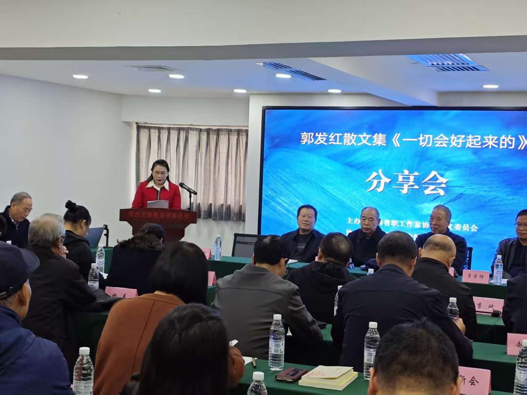 共工新闻社10月20日电(李铂岩/文 吴义/图)10月19日,由陕西省职工作家协会散文委员会主办、《西安晚报》“长安悦读”栏目协办的郭发红散文集《一切会好起来的》作品分享会在西安举办。陕西省职工作协主席周养俊、渭南市作协主席徐喆、陕西工人报社副社长焦晓宁,来自于省内外的知名作家、评论家高亚平、章学锋、张念贻、郝振宇、韩效祖,赵命可及职工作家代表、郭发红家乡作家代表,新闻媒体50余人参加了此次文化活动。活动由省职工作协散文委员会主任周折主持。