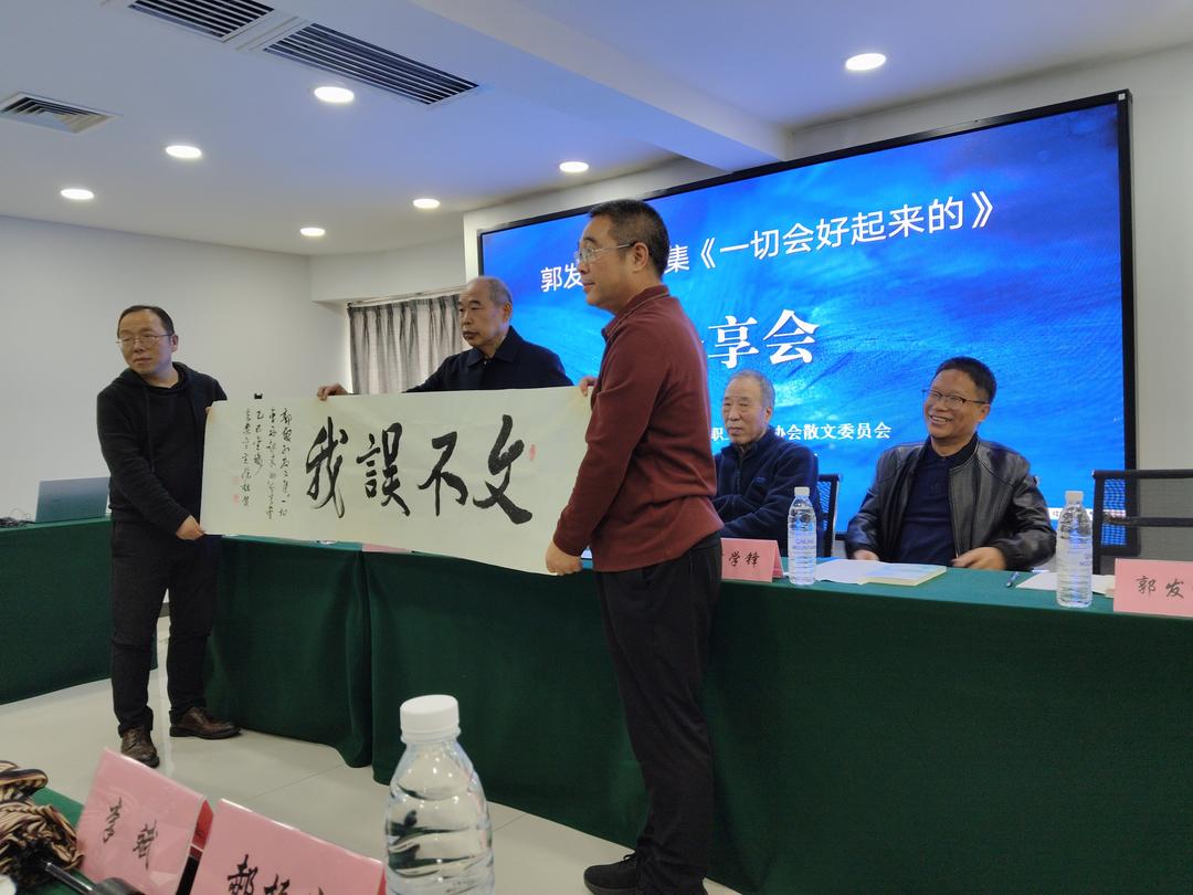 会上,渭南市作协主席徐喆对郭发红多年来的创作成果给予了高度肯定,他认为郭发红是一个将文学血脉刻进骨子里的人、是一位家乡情结浓郁的作家,并以书法“文不误我”赠予郭发红,以示祝贺。