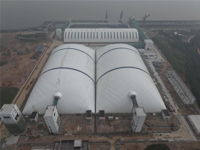中交三航局承建的鄂东散货码头项目,正全力打造长江流域大型现代化砂石散货仓储基地,包含转运站和2个超大型气膜仓,仅单个气膜仓建筑面积就达2.1万平方米,气膜仓采取M型连跨设计,可高效储存机制砂石、石灰岩等矿物散货,投用后预计年吞吐能力达2780万吨。